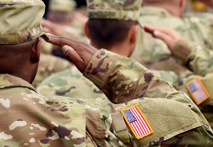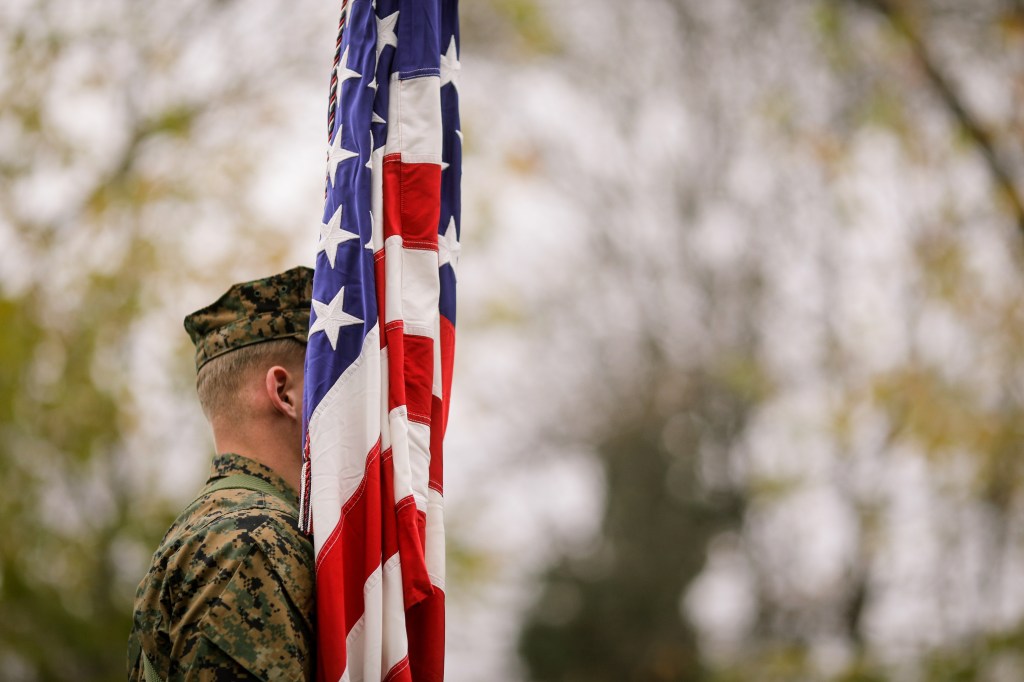 US Army soldier with US flag at a military parade