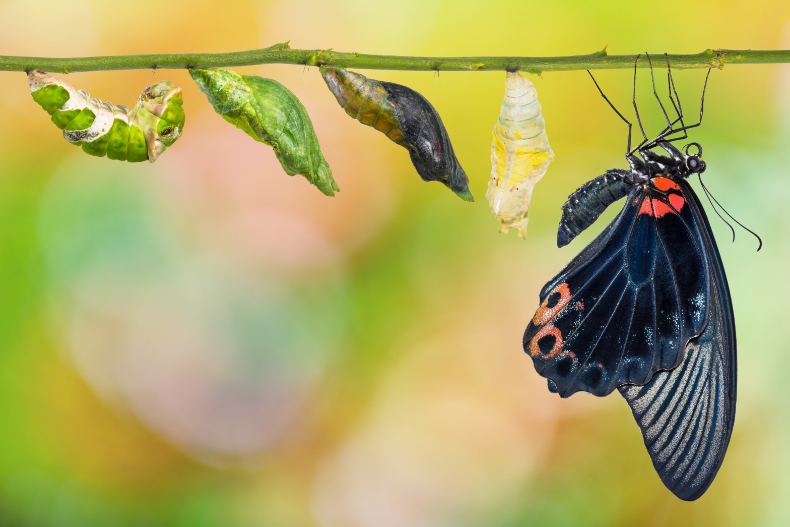 Male Great Mormon (Papilio memnon) butterfly life cycle from caterpillar to pupa and its adult form, isolated on white background with clipping path [All photos Dreamstime stock photos]